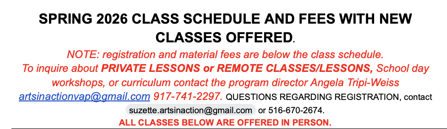 For those interested in remote ZOOM fine art classes or private lessons, please contact, AIAVAP program director Angela Tripi-Weiss at 917-741-2297 or artsinactionvap@gmail.com